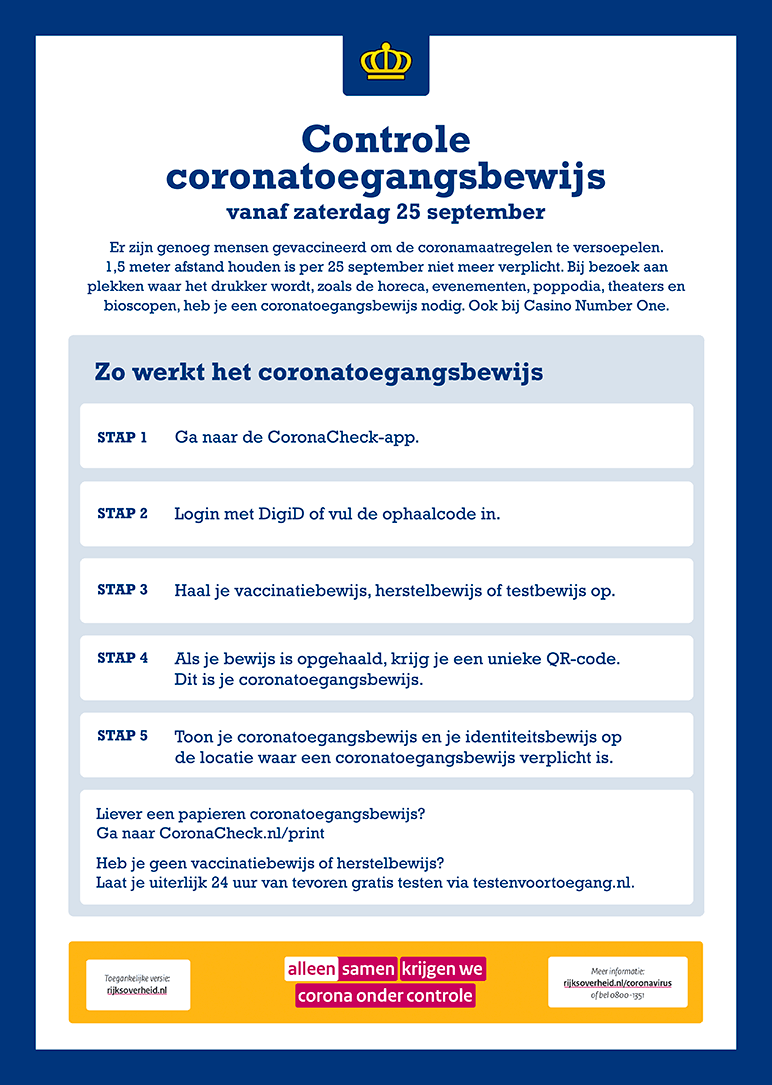 Om veilig en verantwoord te kunnen spelen gelden er een aantal regels in ons casino. U hoeft niet te reserveren, wel zijn wij verplicht om u bij binnenkomst naar uw coronatoegangsbewijs te vragen. Om zeker te weten dat het bewijs van u is dient u ook uw identificatiebewijs te laten zien.
